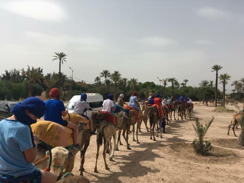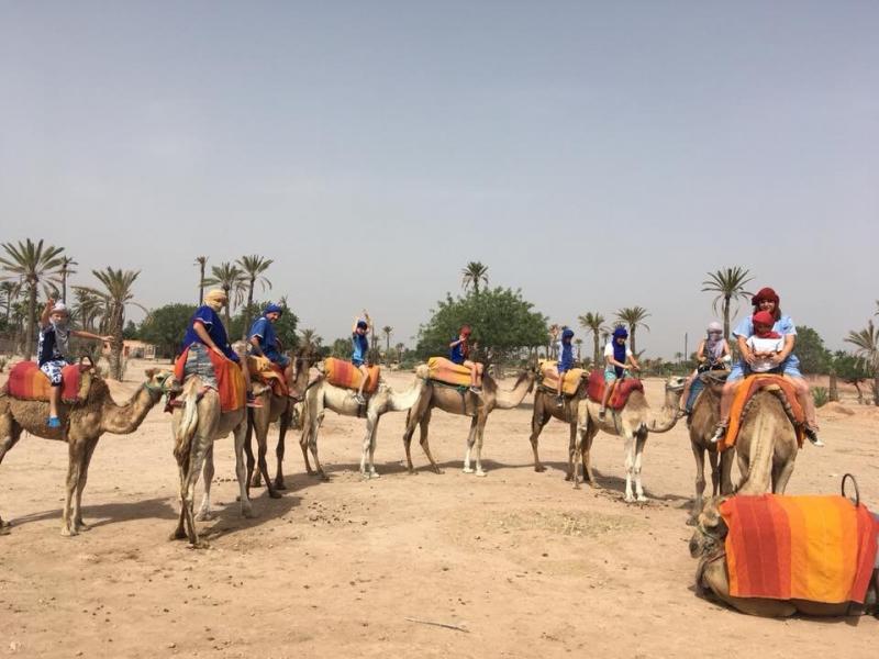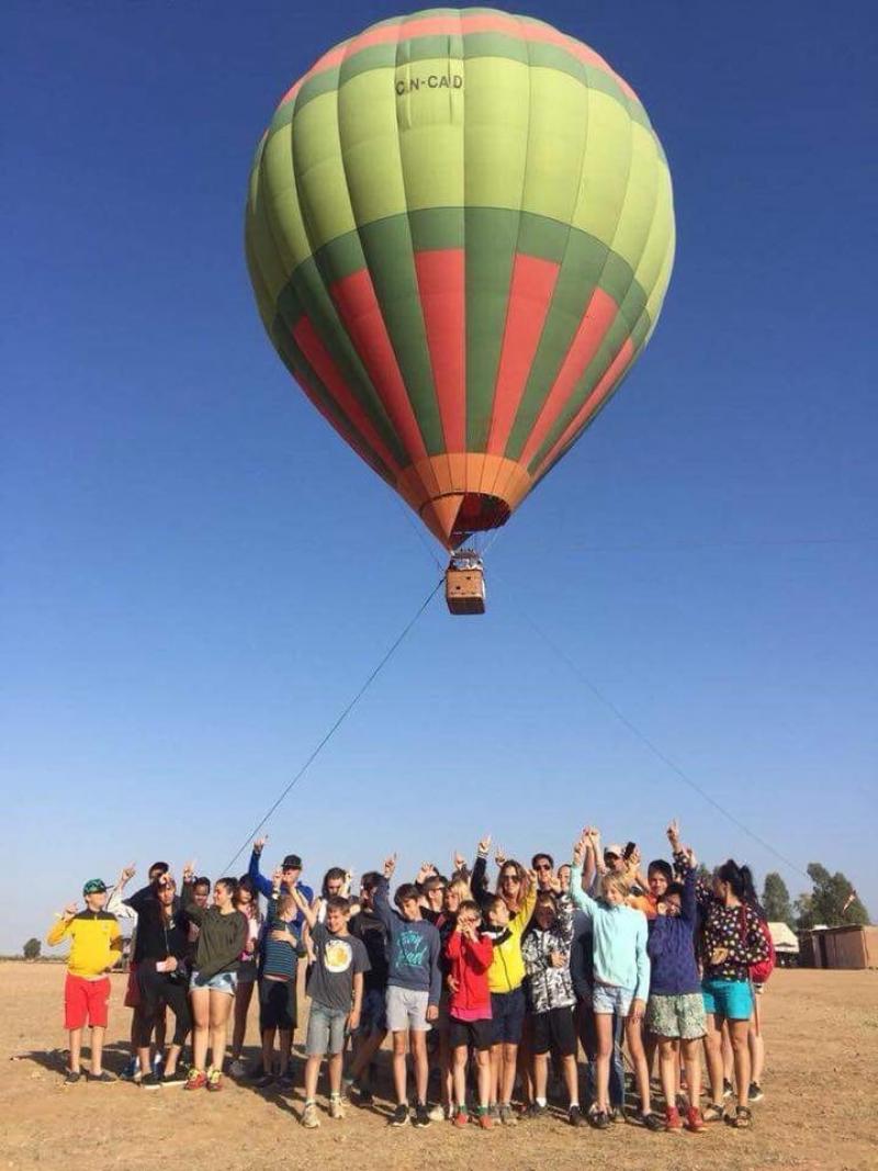 Aujourd’hui, on nous réveille très tôt pour faire de la montgolfière ! Au petit matin, nous voyons devant nous la montgolfière se gonfler. Les animateurs nous expliquent que l’air chaud va la faire décoller. Nous montons par petits groupes dans la nacelle et hop on s’envole! Nos camarades restés au sol ont l’air de playmobil, hihihiii, quelle aventure ! De retour au Domaine, après un bon repas, on découvre que la piscine a été transformée en parcours gonflable! On fait des courses, on glisse et on tombe tous dans l’eau. C’est trop fun, on y joue pendant des heures, on ne s’en lasse pasCe matin, nous n’allons pas très loin, nous allons dans la palmeraie faire du dromadaire! C’est au tour d’Alex des Lasagnes du Coeur de venir avec nous. Les personnes qui s’occupent des dromadaires voilent nos éducateurs et leur mettent des djellabas! Que de fous rires! Mais on n’a pas le temps de s’en remettre, qu’on nous voile nous aussi! Une fois tous voilés, la balade commence! Nous sommes emmenés par les dromadaires comme en plein désert! On chante une chanson de Magic System et on prend le thé chez l’habitant. Quelle bonne humeur !