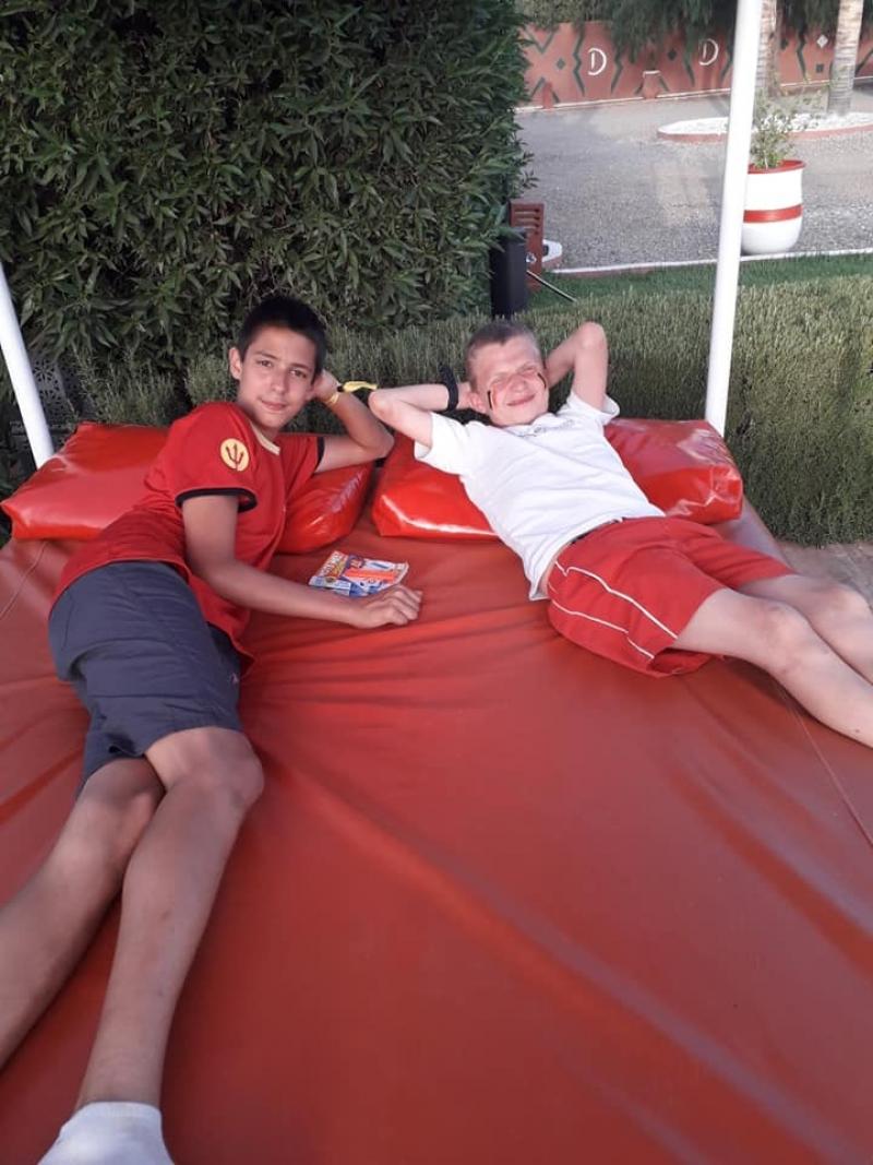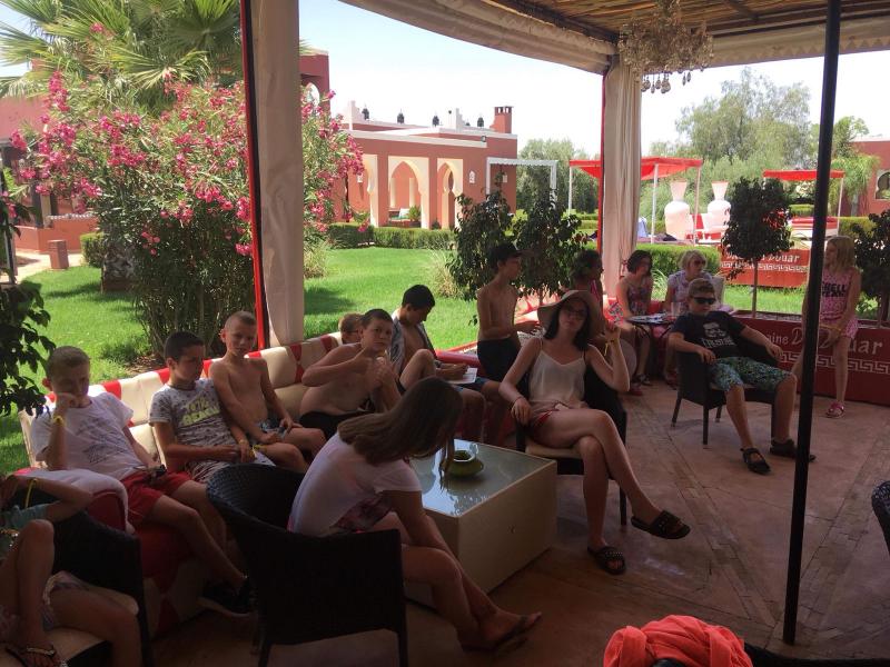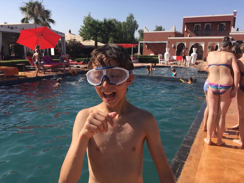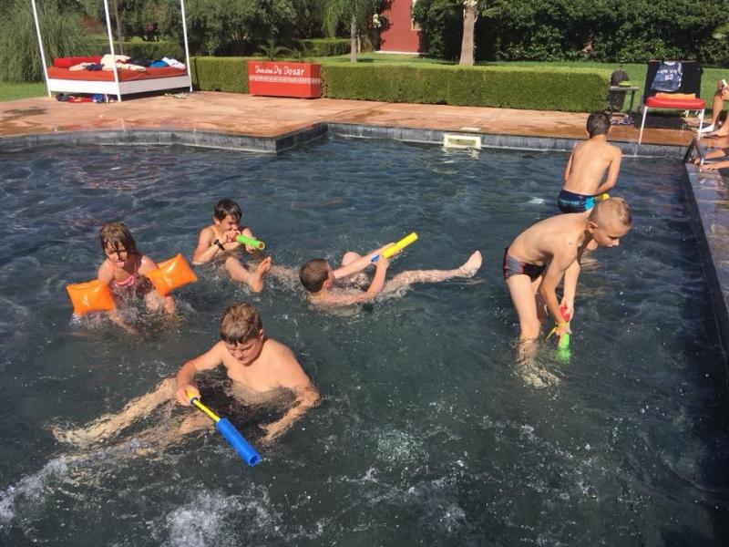 Le lendemain, nous découvrons un domaine magnifique avec une énorme piscine! Nous sommes tellement excités que nous passons toute la journée à jouer dans la piscine! Le soir, c’est le grand soir, nous allons supporter les Diables Rouges contre la France! Après un bon souper tajine, nous mettons notre plus belle vareuse et nous allons regarder le match. Malheureusement, la Belgique a perdu, quelle déception !