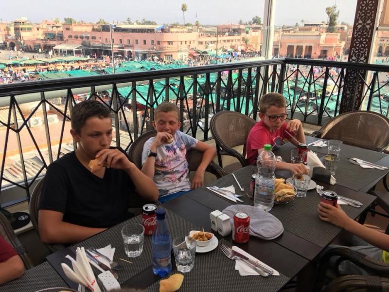 Pour notre dernier jour, nous profitons de la belle piscine du domaine. Aprèsmidi, nous allons à Marrakech, sur la place Jeema el Fna. Nous découvrons les charmeurs de serpents et les singes. Nous allons acheter des souvenirs dans les souks, que c’est beau, on se croirait dans Aladin! Après nos achats, on nous emmène dans un beau restaurant avec une vue sur la place! On mange là-bas, c’est délicieux, et pendant qu’on mange, on voit le soleil se coucher sur la place, c’est un moment magique pour tout le monde.